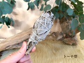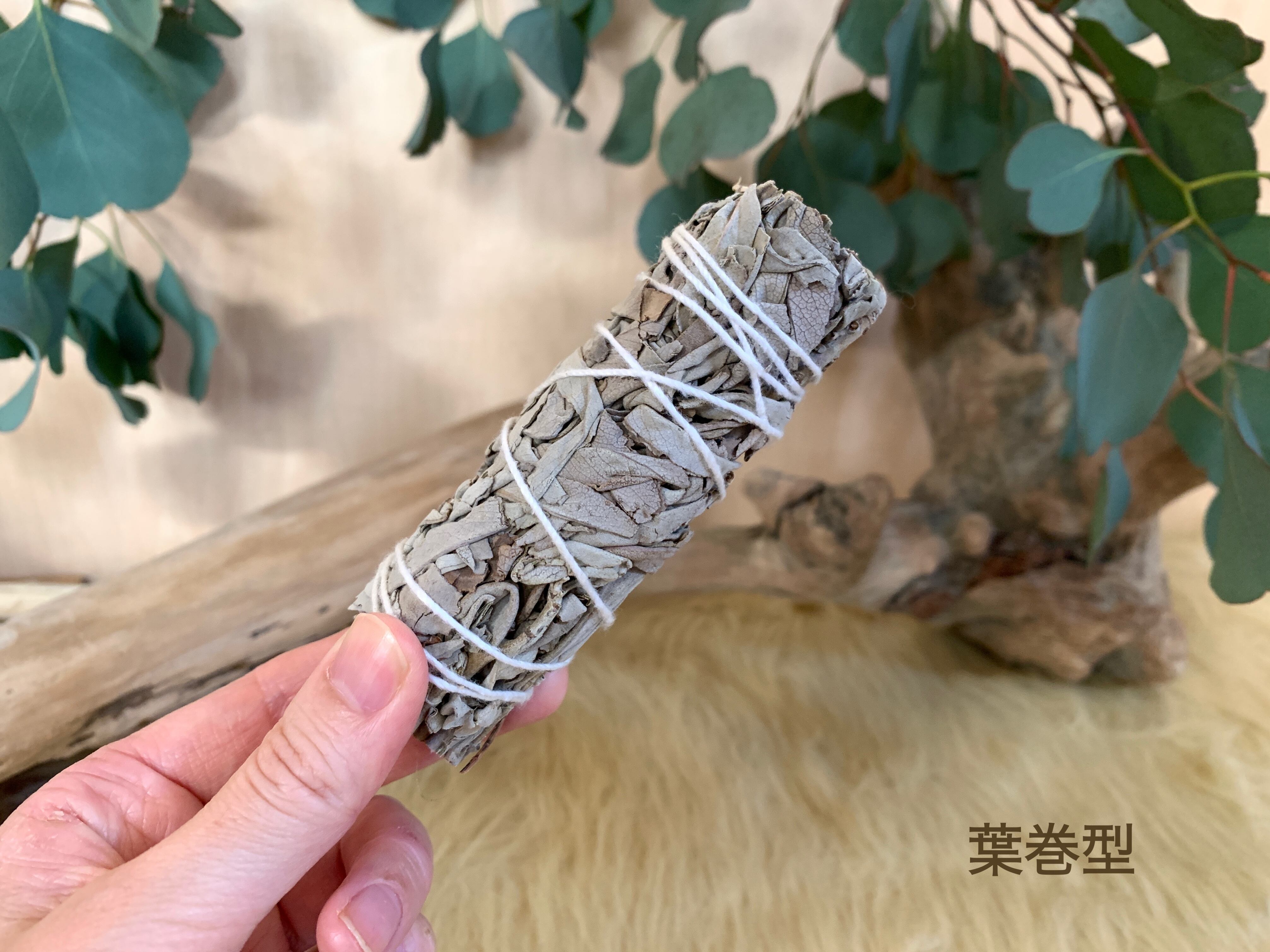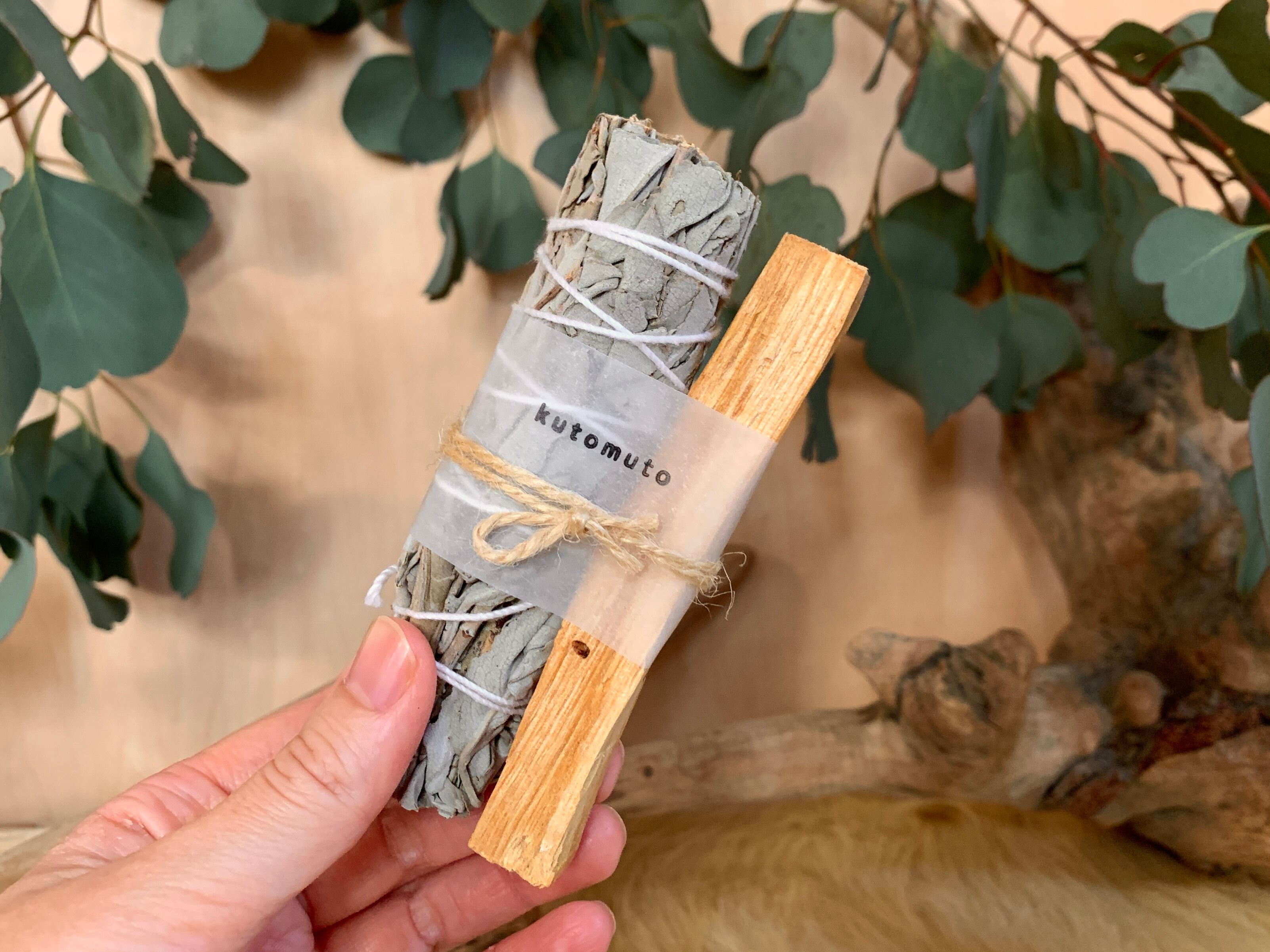 ホワイトセージは葉に火をつけ、軽く振って火を消し、煙を燻らせます。煙が立ち上り始めたらクリスタルやお部屋の浄化に使用してください。香りもぜひ楽しんでください。